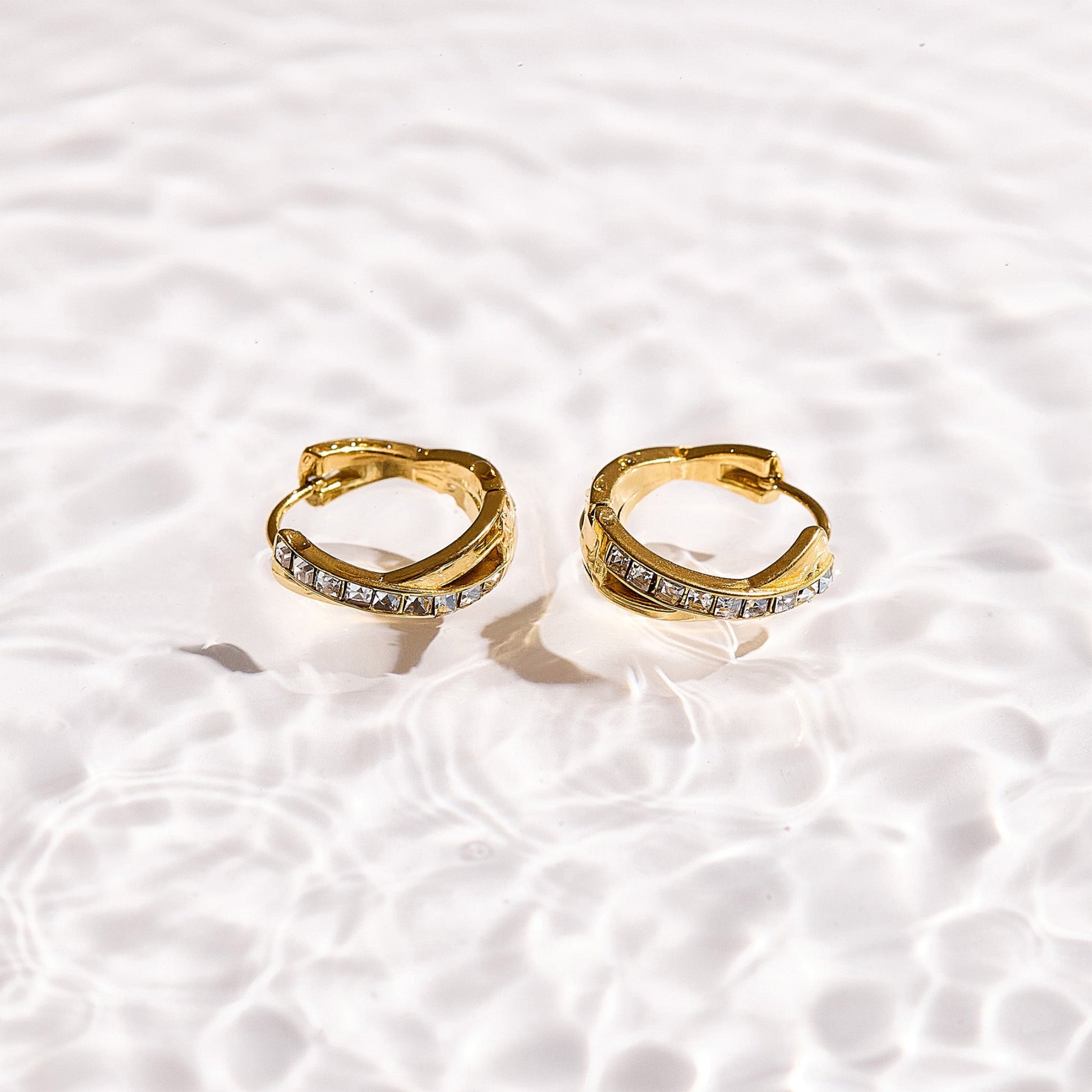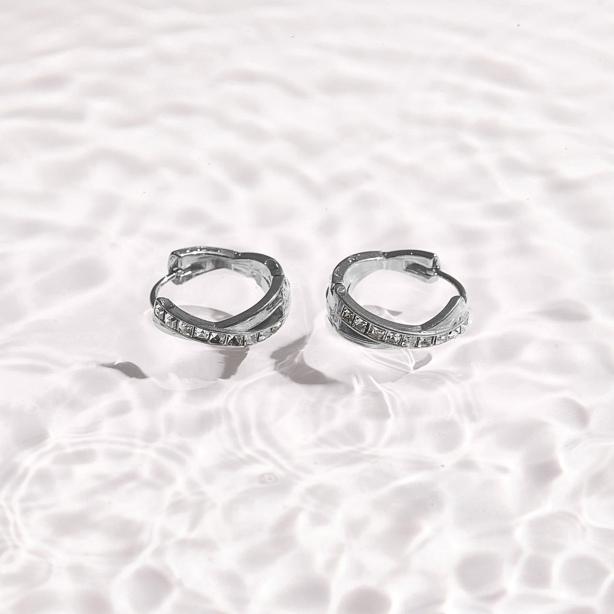 Elevate your earring game with these unique twist hoops, featuring a sleek crossover silhouette lined with square-cut crystals. The geometric shape adds a modern edge, while the shimmering stones bring just the right amount of sparkle. Perfect for day-to-night wear with a polished finish.