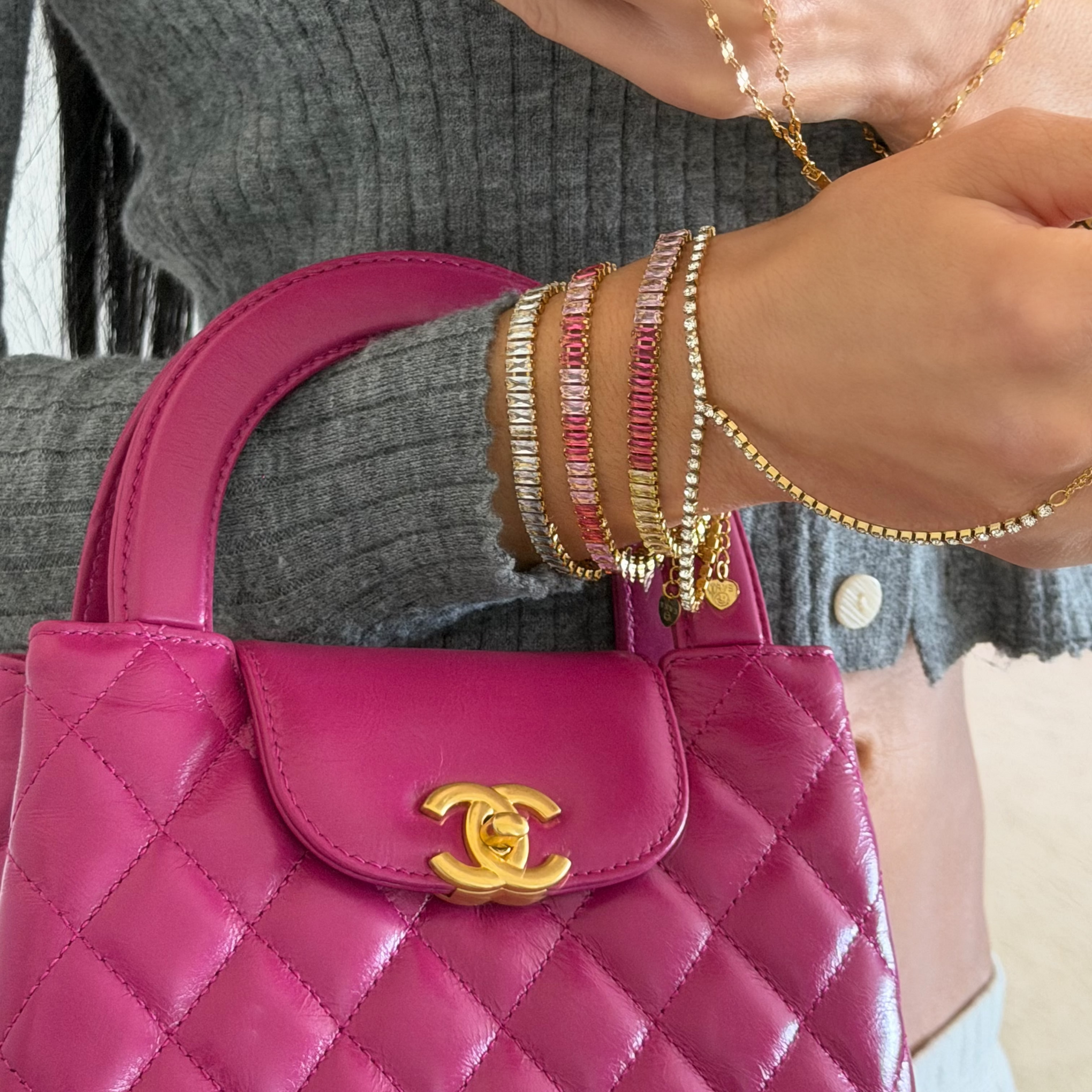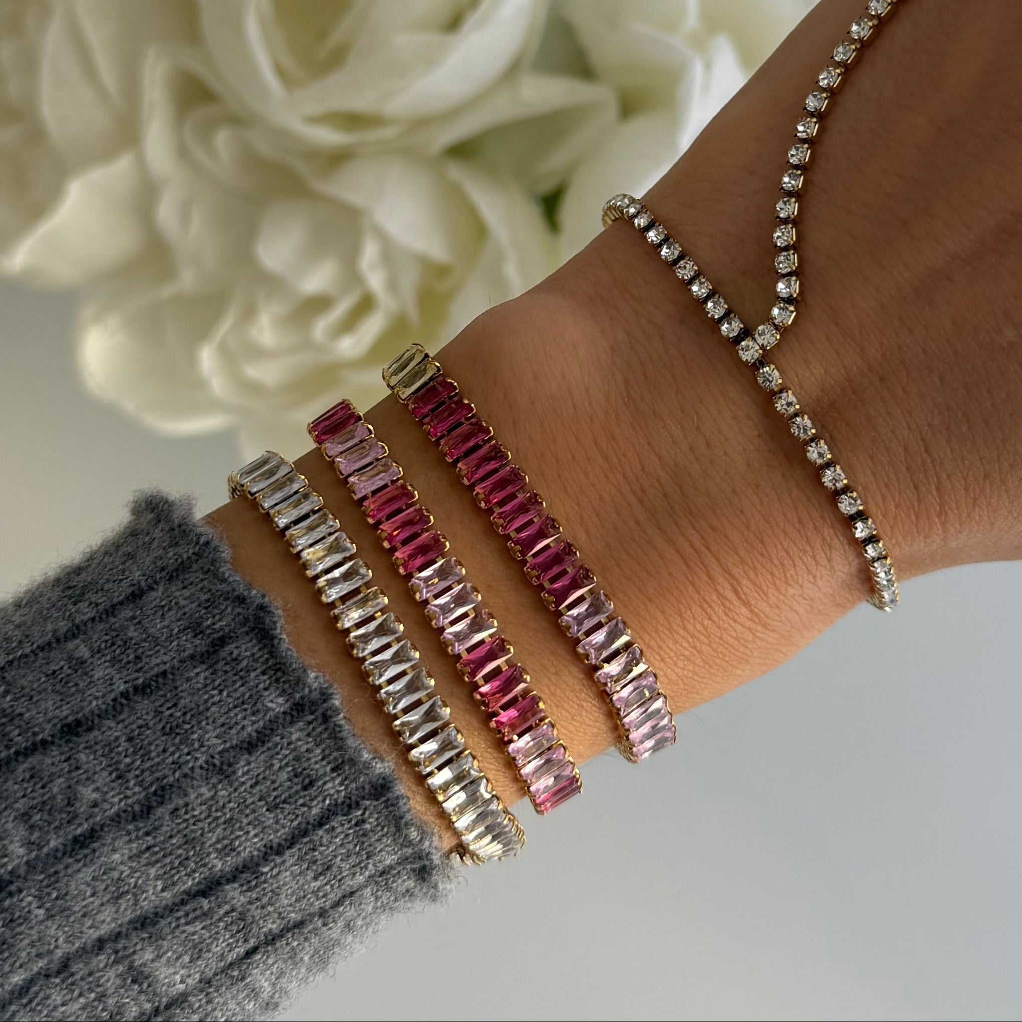 The Frost Beam Tennis Bracelet shines with crisp, icy baguette stones that catch the light with evry move. Sleek, sparkly, and effortlessly glam, it adds that cool-girl shimmer to any wrist stack. A standout piece made for those who love a bright, frosty glow. ???