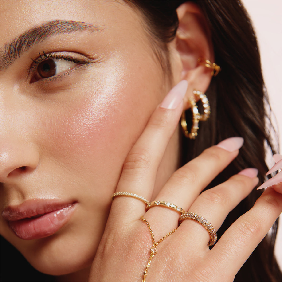 To keep your rings shiny and looking fresh, gently clean them with a soft cloth and avoid harsh chemicals. Take your rings off in water, like showers or pools, to protect their finish—unless it’s from our tarnish-free waterproof collection, which is made to be worn worry-free in water!