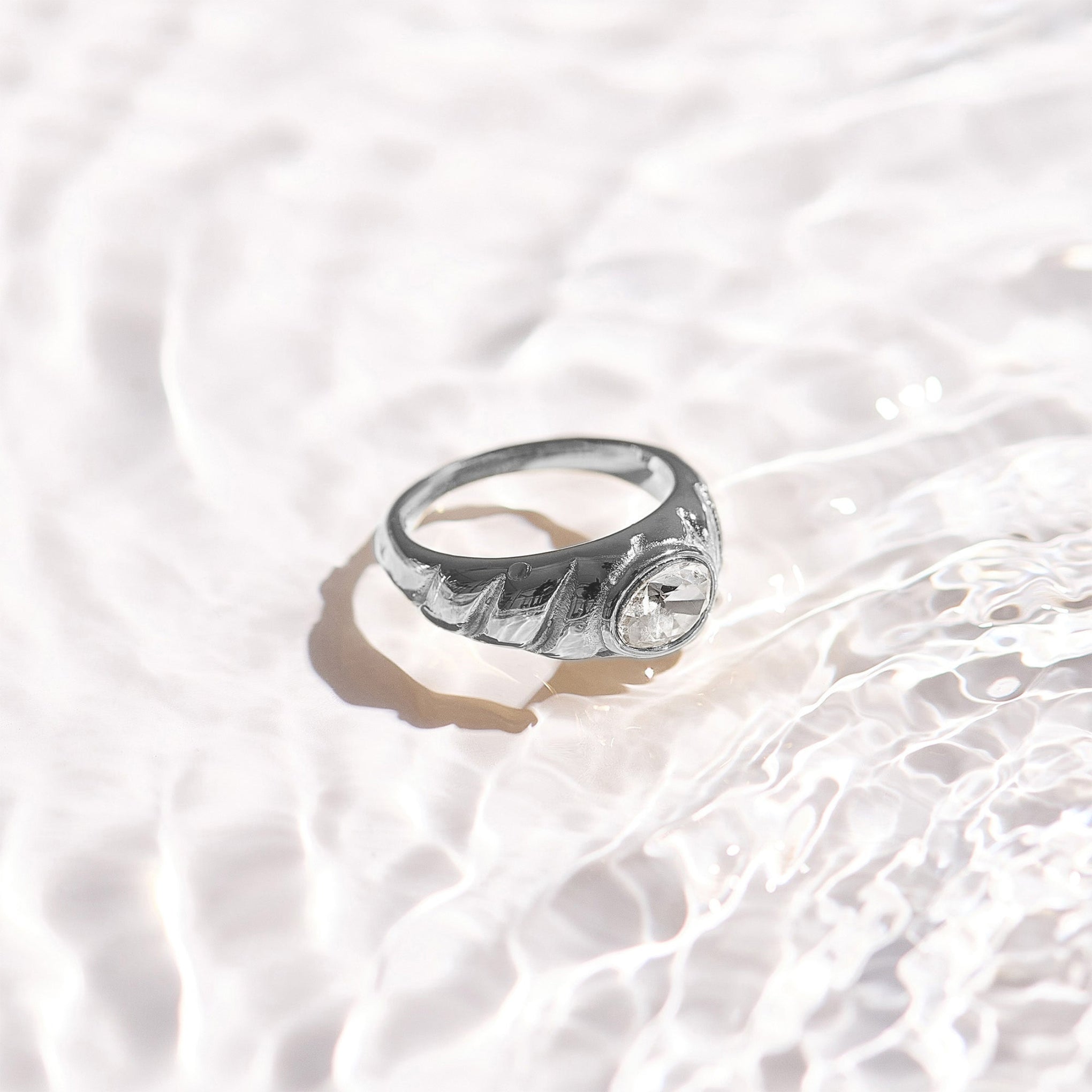Bold and sculptural, this dome ring features a sleek grooved band and a raised oval-cut crystal centerpiece. The bezel setting adds a modern edge while keeping the look clean and secure. Wear it solo for impact or pair it with your everyday stack for a statement twist.