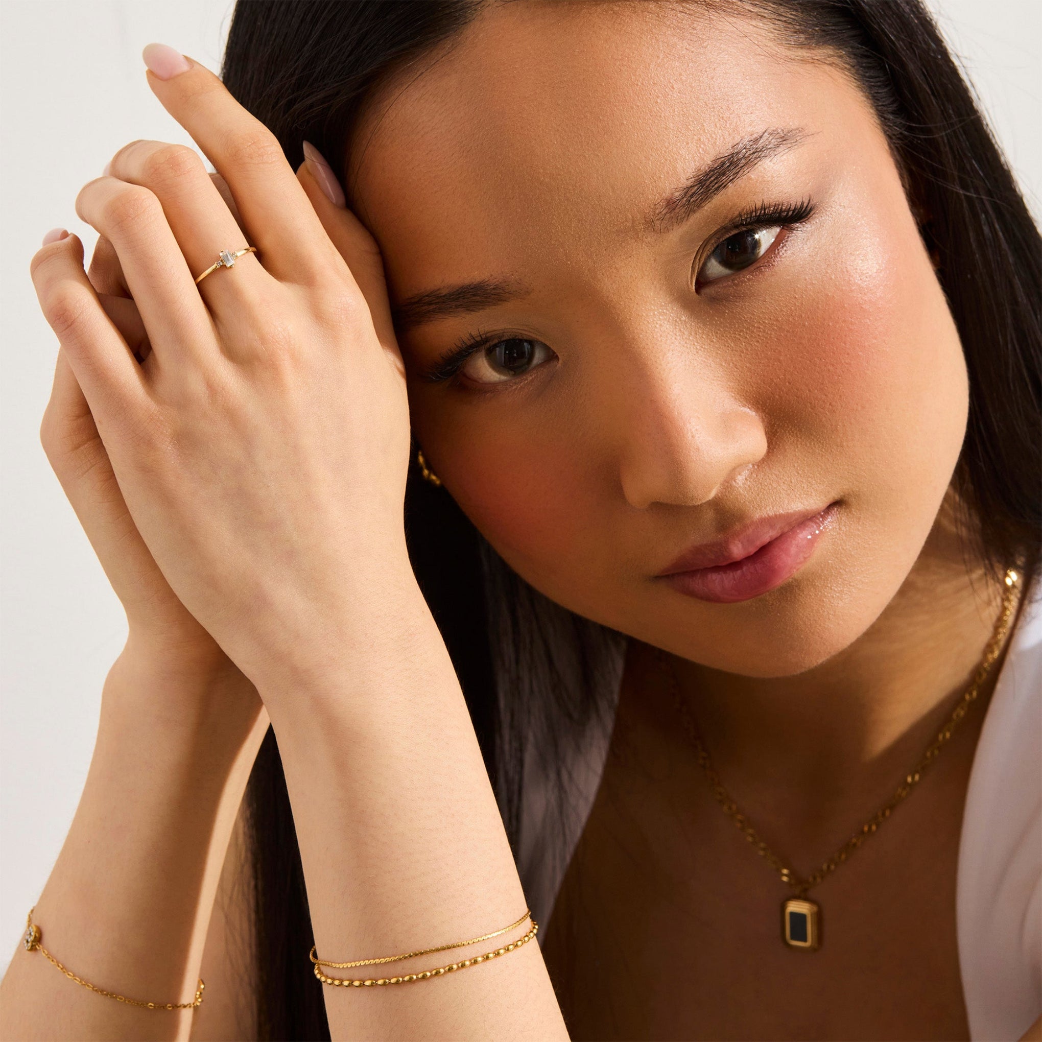 To keep your rings shiny and looking fresh, gently clean them with a soft cloth and avoid harsh chemicals. Take your rings off in water, like showers or pools, to protect their finish—unless it’s from our tarnish-free waterproof collection, which is made to be worn worry-free in water!