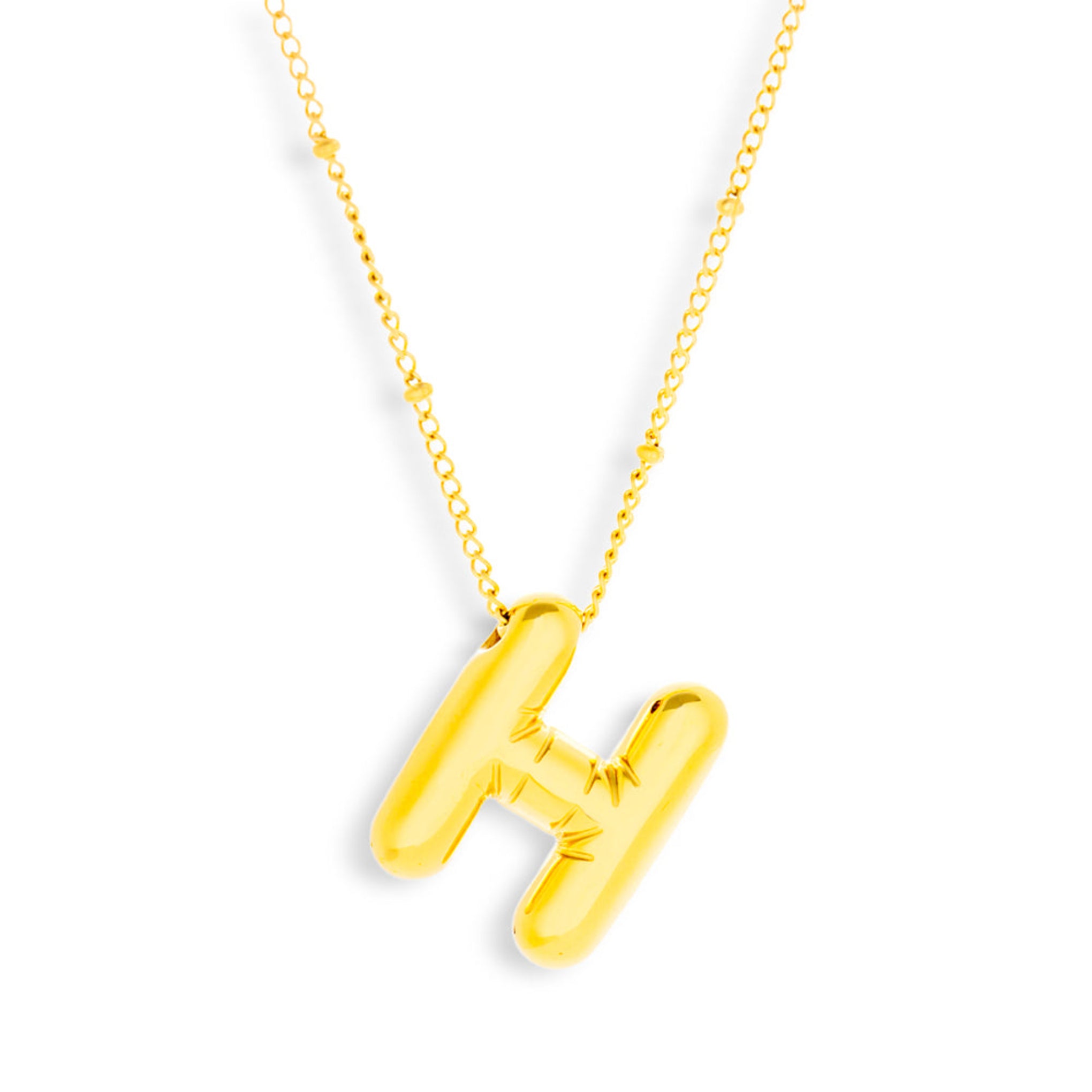 Show off your individuality with this bold balloon letter initial necklace. Featuring a chunky, sculpted pendant with engraved sunburst detailing, this piece combines personal flair with modern edge. This bubble initial necklace is perfect addition to any necklace stack