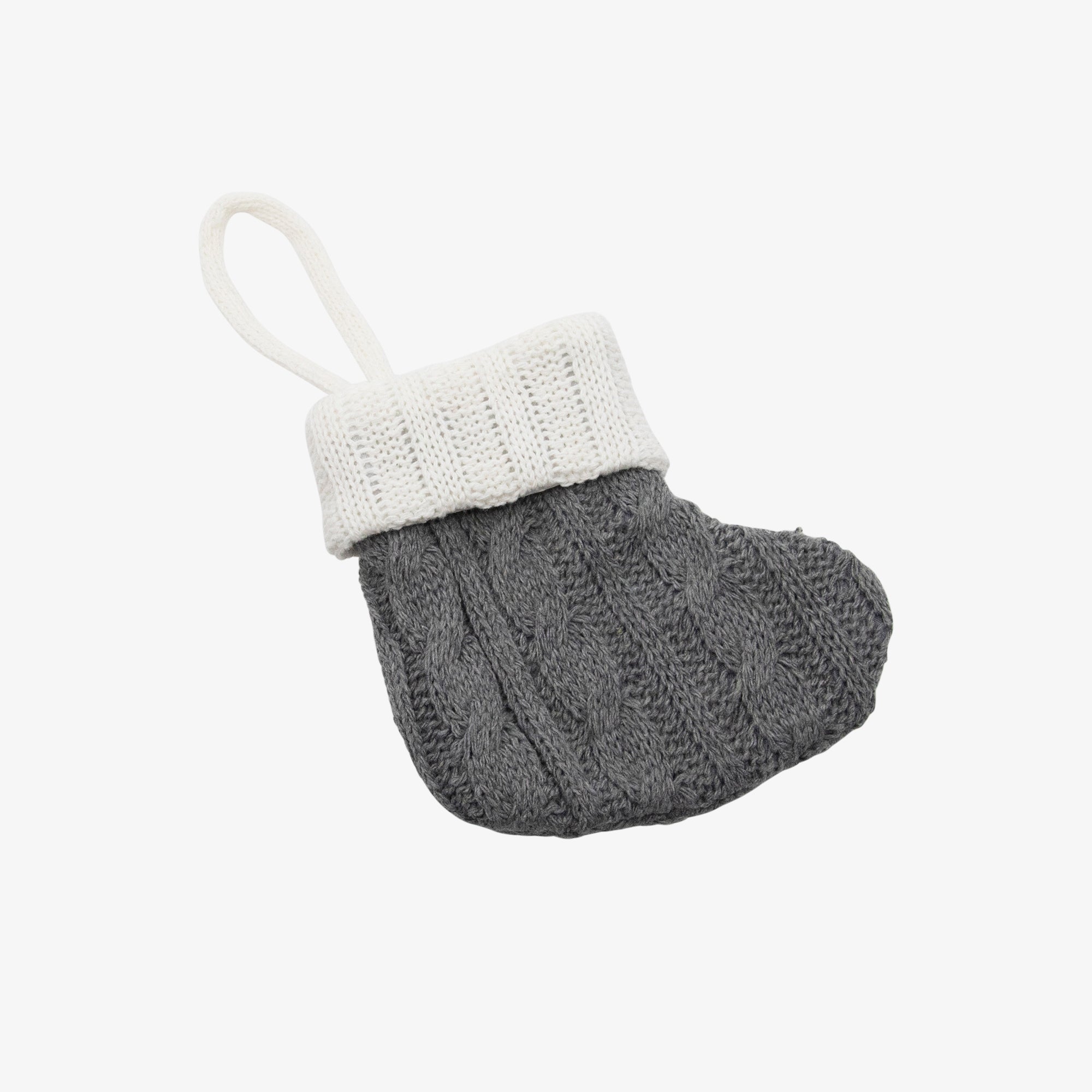 Festive grey knit stocking perfect for hoiday gift packaging or decor. A Fun and cozy way to present jewelry, small gift or stocking stuffers.
